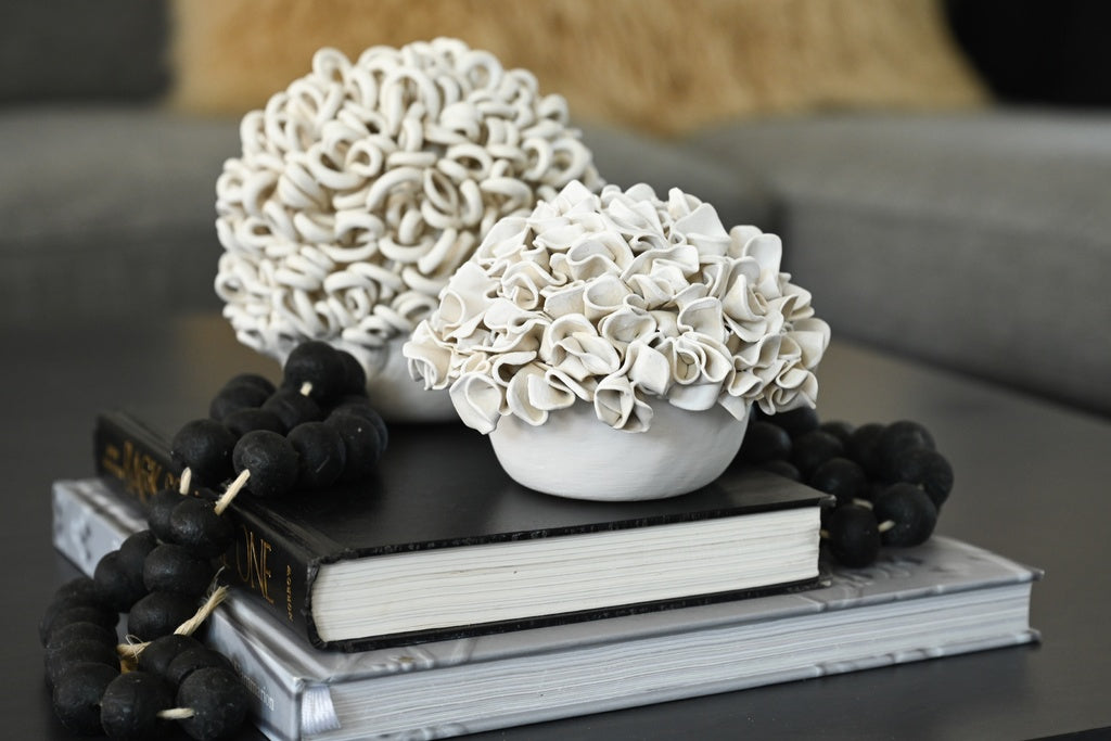 A bold porcelain sculpture featuring an intricate surface of hand-formed looping coils. Its flowing, abstract texture brings a playful yet modern touch to shelves, mantels, or tabletop displays.