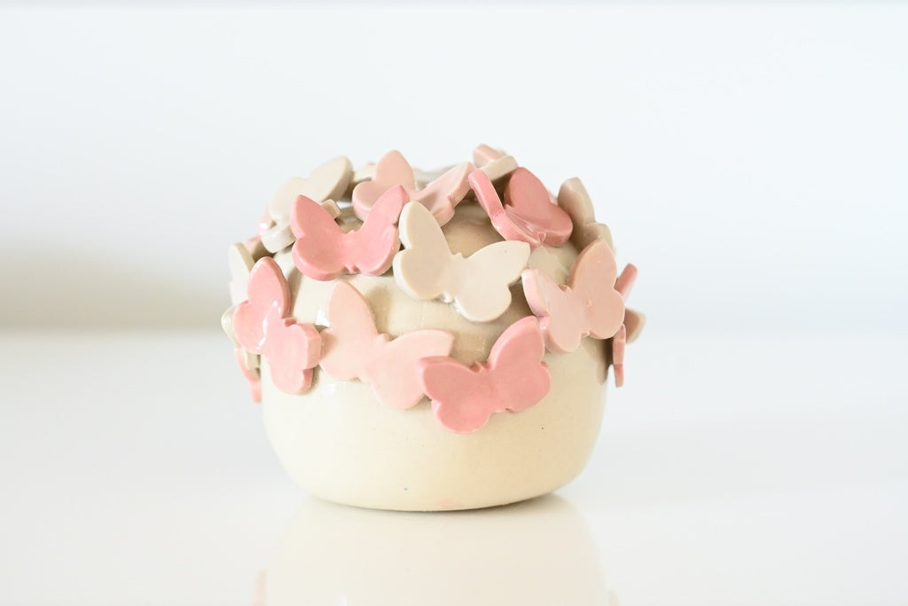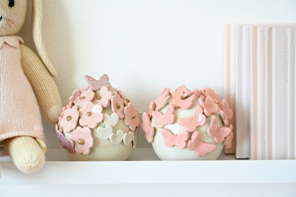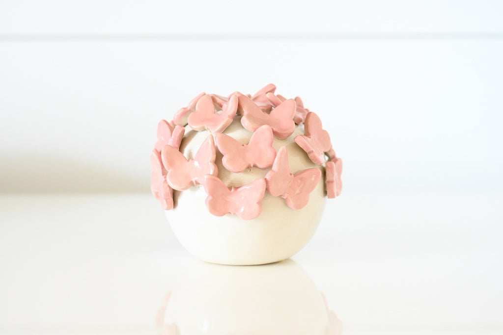 Small porcelain sphere adorned with soft pink butterflies. Perfect for a nursery or children's bedroom.