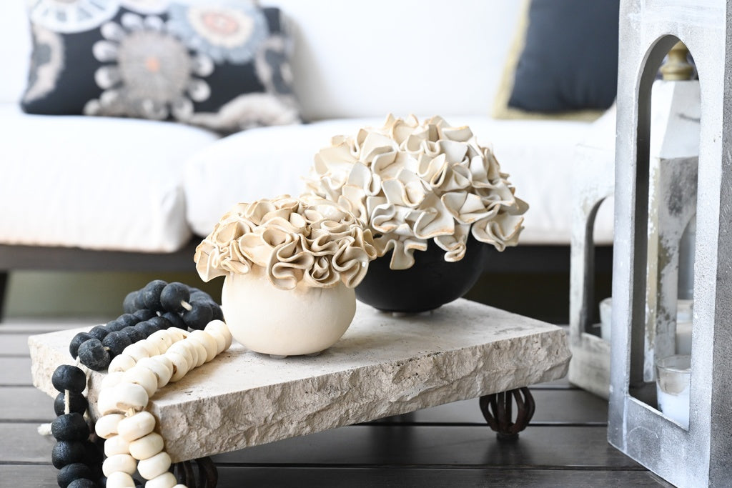 Elegant porcelain sculpture featuring flowing, ruffled petal textures in a soft neutral tone. A striking decorative piece that adds organic beauty and dimension to any space.