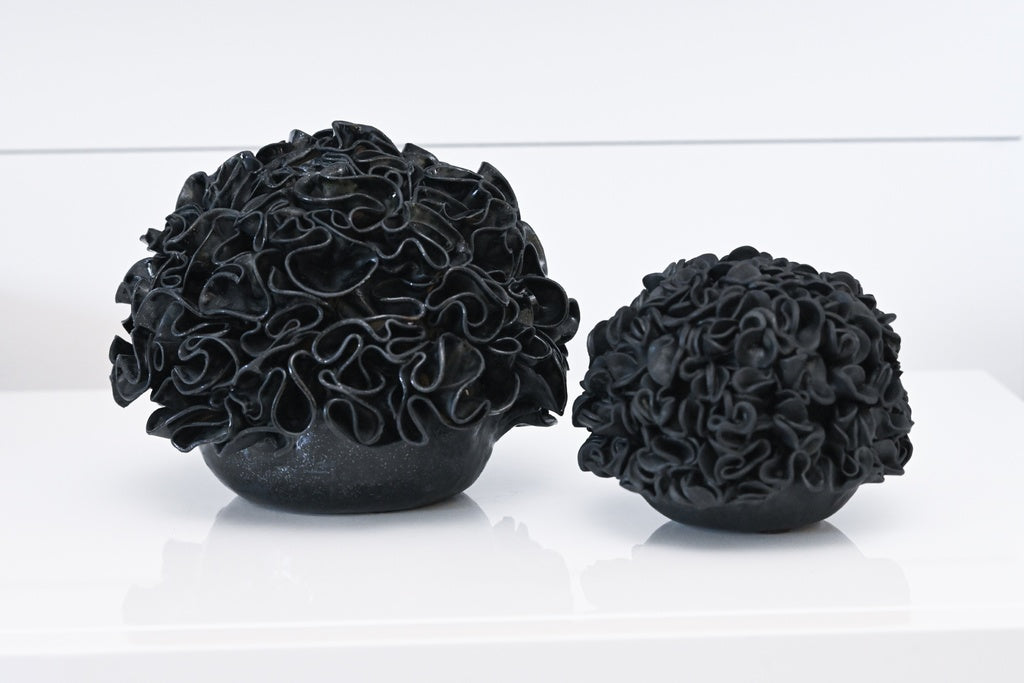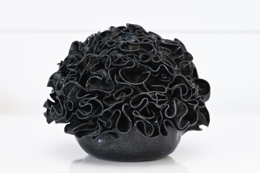Elegant porcelain sculpture featuring flowing, ruffled petal textures in a stunning black tone. A striking decorative piece that adds organic beauty and dimension to any space.