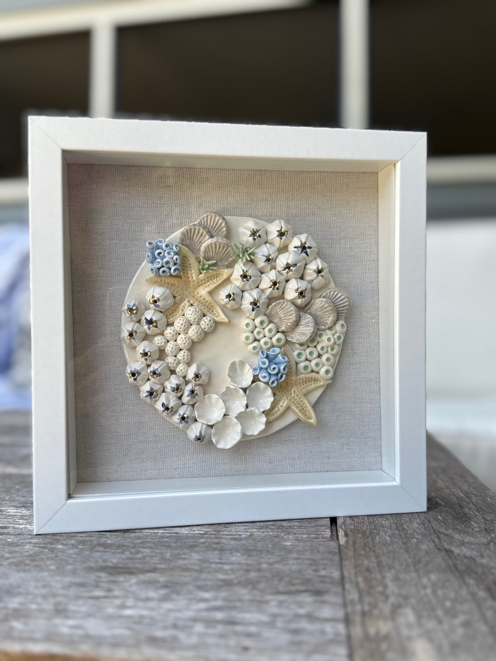 This elegant wall art captures the beauty of the ocean floor with intricate coral-like textures, and sea-inspired details. Soft tones of cream, blue, green, and sandy beige come together to create a serene, coastal aesthetic. Set in a clean oak shadow box frame, it blends modern minimalism with organic texture. Perfect for adding a refined, artistic touch to your home decor or gallery wall.